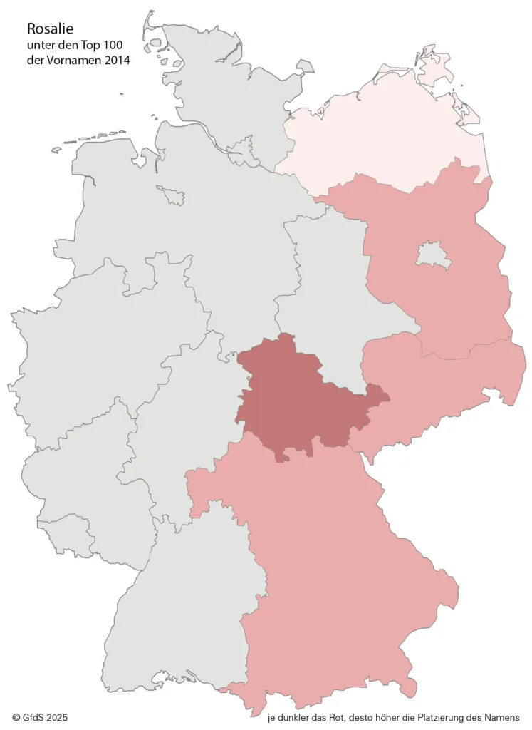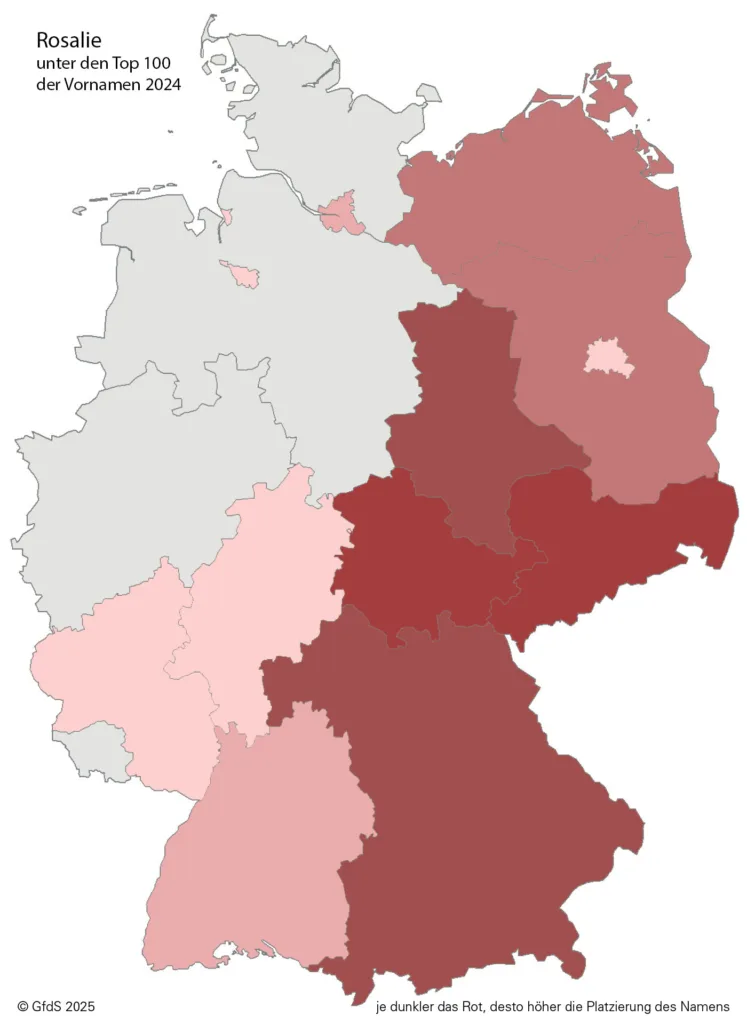 Je dunkler der Farbton, desto höher die Platzierung innerhalb der Top 100. Grau gefärbt sind jene Bundesländer, in denen der Name nicht unter den Top 100 steht.