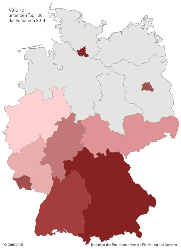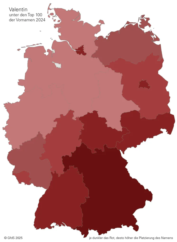 Je dunkler der Farbton, desto höher die Platzierung innerhalb der Top 100. Grau gefärbt sind jene Bundesländer, in denen der Name nicht unter den Top 100 steht.
